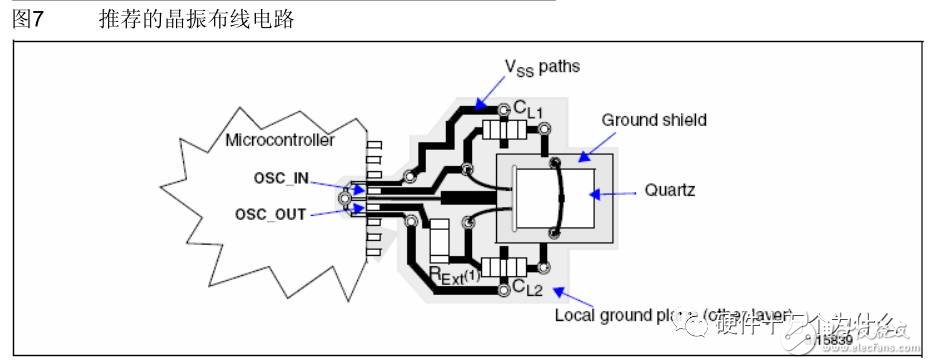 4. 像图7所示来布地线是一个好的作法。这种布线方法将振荡器的输入与输出隔离开来,同时也将振荡器和临近的电路隔离开来。所有的V SS 过孔不是直接连到地平面上(除晶振焊盘之外),就是连接到终端在C L1 和C L2 下方的地线上。