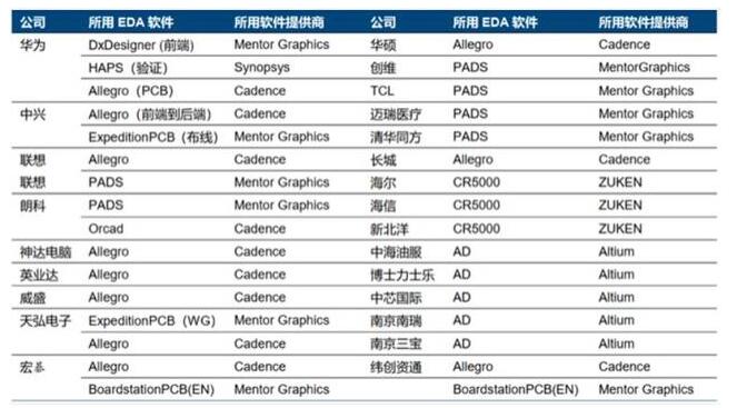 如上图所示,华为从前端、到验证到PCB使用的都这三大巨头的产品,还有像中兴、联想等企业,基本上都使用的是这三大巨头的产品,很少有厂商使用国产的产品。