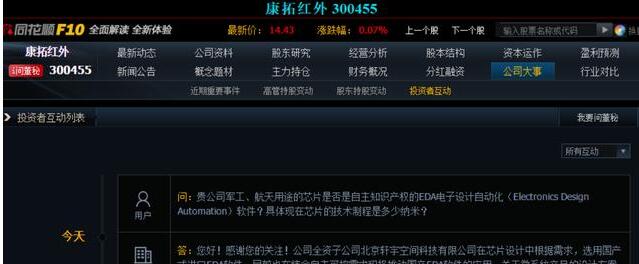 公司全资子公司北京轩宇空间科技有限公司在芯片设计中根据需求,选用国产或进口EDA软件,目前也在结合自主可控需求积极推动国产EDA软件的应用。