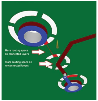 增加布线选项的另一种方法是将通孔放置在焊盘中,只要保持连接完整性,就可以将通孔直接放在焊盘中,并将连接放置到其他层,而不要在顶部或底部层上部署组件。