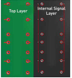 您可以看到,通孔过孔的挑战是路由占用顶层和底层以及内部信号层的不动产。 在任何一个通道放置,您正在连接到其他层,但由于通过布局和清除规则,您丢失了这些层上的路由区域。