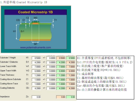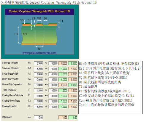 单端信号微带线(带共面地线)阻抗计算示意图: