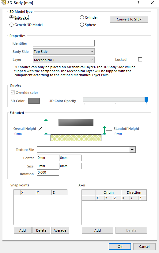 Altium Designer提供三种基本3D形状类型,用于创建机械模型:挤压,圆柱和球体。它们中的每一个可以单独使用或彼此组合使用。挤压模型可能是最常用的。要创建一个这种模型,绘制任何多边形的形状,然后给这个形状一个高度值即可。该形状将被向上(或向下)挤出该高度。