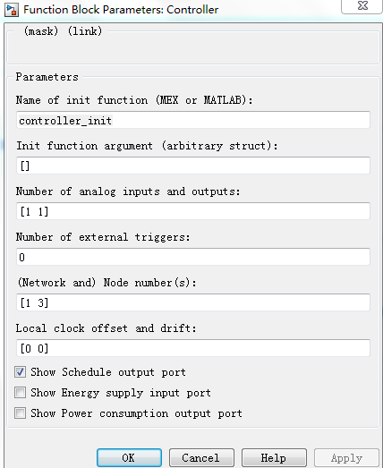 控制器部分用于接收TrueTime Network的消息,其处理后再传递给TrueTime Network,另外,需要给它输入一个阶跃信号作为系统的参考信号。控制器节点以及参数设置分别如图9和图10所示。