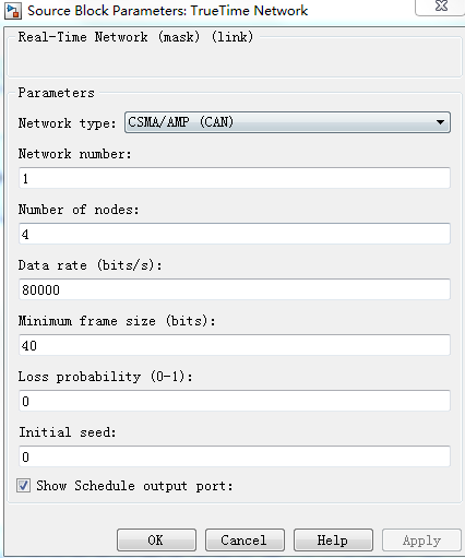 TrueTime Network向NCS供应了通信资源,包含了各种网络参数,如Network number、Number of nodes、Data rate(bits/s)、Minimum frame size(bytes)、Preprocessing delay(s)、Postprocessing delay(s)、Loss probability(0~1)等。TrueTime工具箱中预定义了多种调度策略,比如固定优先级(FP,Fixed Priority),单调速率(RM,Rate Monotonic),截止期单调(DM,Deadline Monotonic),最小截止期优先(EDF,Earliest Deadline First)等。
