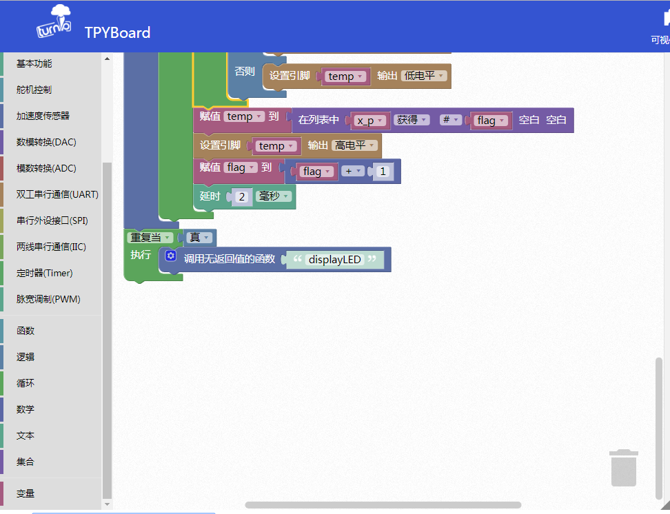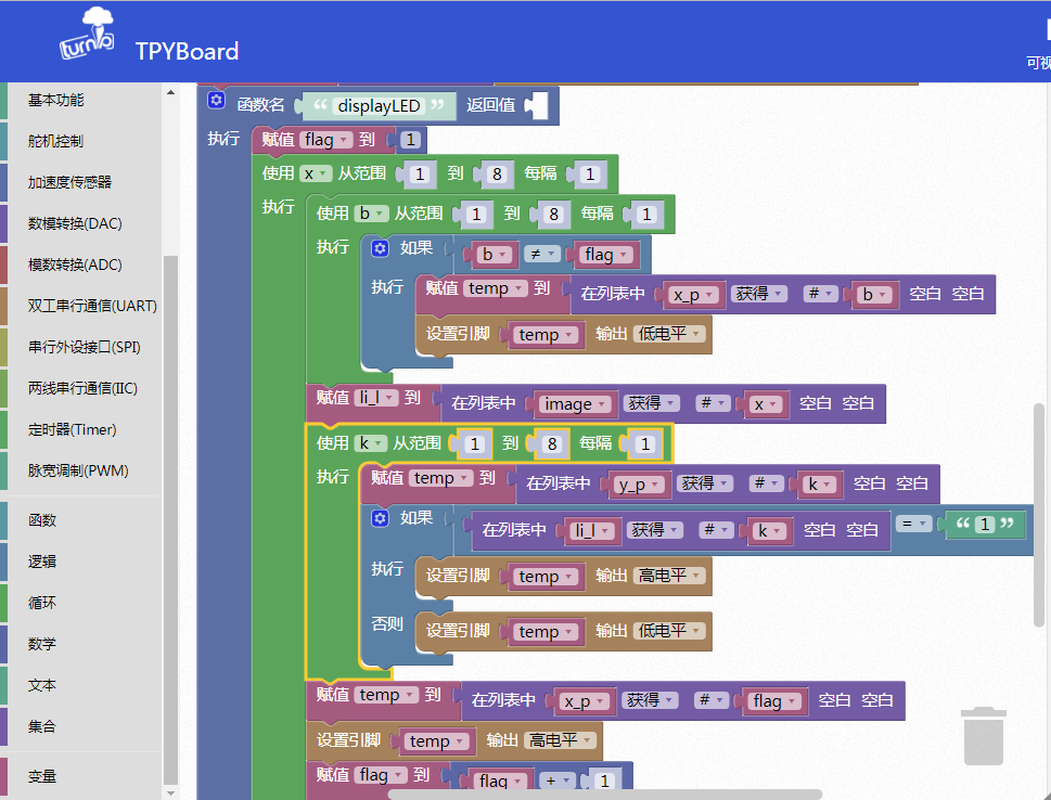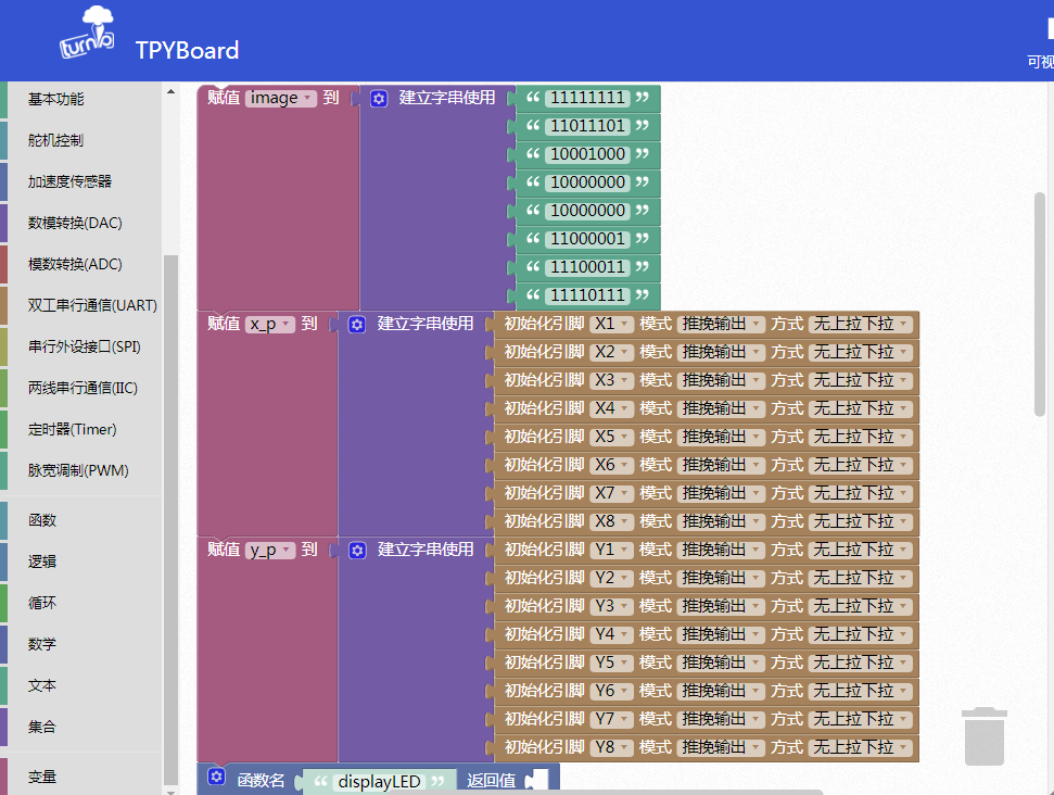 点阵后面有两排针脚,一排以1开头,即1-8针脚,一排以9开头(8针脚的正对面的针脚),即9-16针脚,上图中圆圈内的数字即为针脚的对应序号。ROW 1对应的针脚就是9。当某ROW 的针脚为高电平,某COL的针脚为低电平时候,它们交叉点的LED就会被点亮。 为了方便操作行和列,我们可以将ROW的8个引脚接到我们TPYBoard v102的X1-X8,COL的8个引脚接到我们TPYBoard v102的Y1-Y8。这样我们通过控制X引脚和Y引脚的高低电平就可以控制每一个LED的亮与不亮,这样就可以设计想显示的任何字符和图形,快来试试吧。