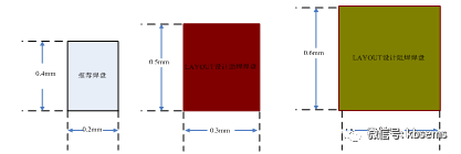 依据IPC 7351标准封装库并参考器件规格书推荐的焊盘尺寸进行封装设计。为了快速设计,Layout工程师优先按照推荐的焊盘尺寸上进行加大修正设计,PCB助焊焊盘设计长宽均加大0.1mm,阻焊焊盘也在助焊焊盘基础上长宽各加大0.1mm。如图一所示: