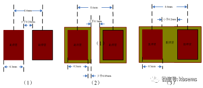 常规PCB阻焊工艺要求覆盖助焊焊盘边沿0.05mm,两个助焊盘阻焊中间阻焊桥大于0.1mm,如图二(2)所示。在PCB工程设计阶段,当阻焊焊盘尺寸无法优化时且两个焊盘中间阻焊桥小于0.1mm,PCB工程采用群焊盘式窗口设计处理。如图二(3)所示: