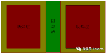 当两个助焊焊盘边沿间距大于0.2mm以上的焊盘,按照常规焊盘对封装进行设计;当两个助焊焊盘边沿间距小于0.2mm时,则需要进行DFM优化设计,DFM优化设计方法有助焊和阻焊焊盘尺寸优化。确保PCB制造时,阻焊工序的阻焊剂能够形成最小阻焊桥隔离焊盘。如图三所示:
