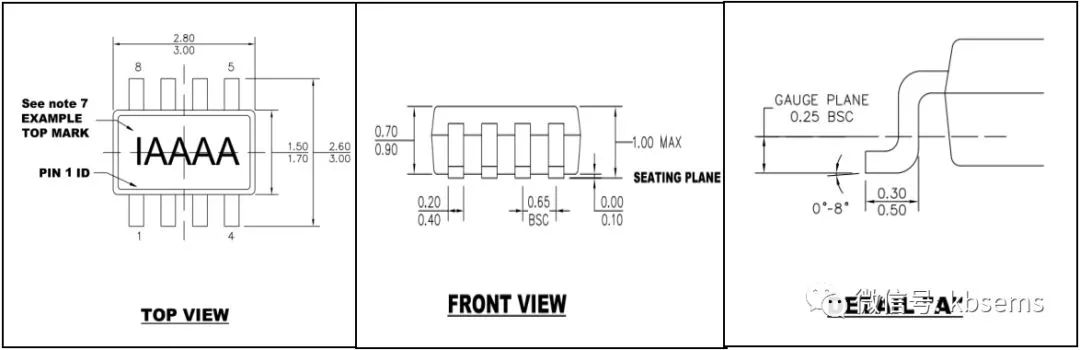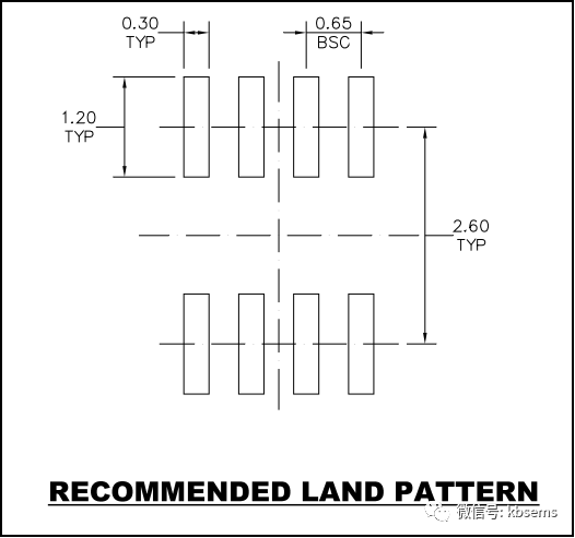如下图四,器件引脚中心间距:0.65mm,引脚宽度:0.2~0.4mm,引脚长度:0.3~0.5mm。
