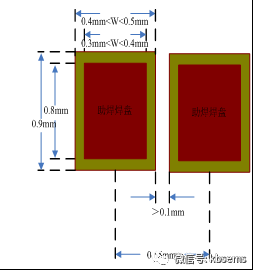 按照图八对助焊焊盘宽度进行削铜处理,调整阻焊宽度焊盘大小。保证器件两助焊焊盘边沿间大于0.2mm,两阻焊焊盘边沿间大于0.1mm,助焊和阻焊焊盘长度保持不变。满足PCB阻焊单焊盘式窗口设计的可制造性要求。