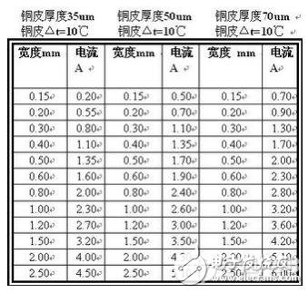 不同厚度,不同宽度的铜箔的载流量见下表: