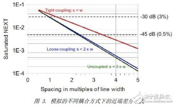 随着差分对的间距加大,近端串扰将随着减小。图3模拟了三种不同差分耦合方式的情况下,差分对之间近端串扰的情况。