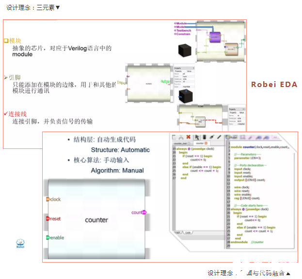 Robei将芯片设计高度抽象画,并精简到三个元素:模块、引脚、连接线。采用框图和代码相融合的设计模式,结构层(模块、引脚、例化)自动生成代码。