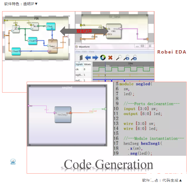 Robei EDA工具特点:简单易用、例化直观、代码生成、跨平台、分层设计、数字前端设计、所见即所得、波形查看、语法检查、IEEE1364-2005。