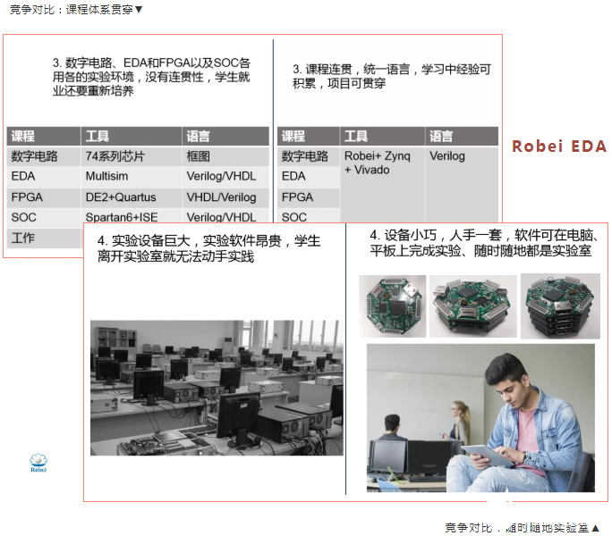 Robei 有自己设计的核心板,有配套的教材和实验指导书,知识产权相对完善。