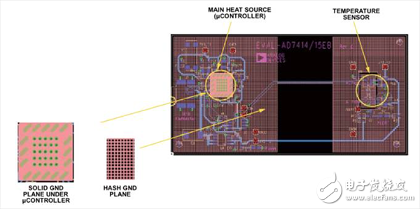 当然,有很多人是不需要测量PCB的温度的,他们只想测量环境温度。问题是,如何防止PCB上的热源影响温度传感器对环境温度的测量?使用如图4所示的PCB布局设计,问题就能迎刃而解。