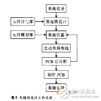 电路级设计工作流程如图2所示,电子工程师接受系统设计任务后,首先确定设计方案,同时要选择能实现该方案的合适 元器件,然后根据具体的元器件设计电路原理图。接着进行第一次仿真,包括数字电路的逻辑模拟、故障分析、模拟电路的交直流分析、瞬态分析。系统在进行仿真时,必须要有元件模型库的支 持,计算机上模拟的输入输出波形代替了实际电路调试中的信号源和示波器。这一次仿真主要是检 验设计方案在功能方面的正确性。