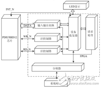由于PDUSBD12在读写时序上有时间限制,例如每次些操作之间的间隔不能小于50 ns,而FPGA的系统时钟频率一般都比较高,所以不能直接使用系统时钟控制PDIUSB12,必须进行分频。分频器模块的功能也就是按照要求有系统时钟生成所需频率的时钟信号。