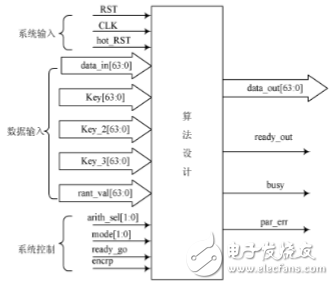 根据实际需求,将加密算法模块进行独立设计,如图3所示为封装后I/0接口示意图。