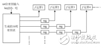 密钥产生单元由选择控制电路PC 一1、循环移位寄存器及压缩置换电路PC 一2构成。该部分的输人是64 b初始密钥;输出为每次迭代运算用的子密钥。对于总共16轮循环运算,每一轮密钥的使用采用的方式如图4所示,在初始密钥输人的第一个周期产生所有16轮加密需要的不同密钥同时并行输出,然后根据相应的周期顺序,每一轮的密钥输出采用寄存器向后顺延一个时钟周期作为该轮算法的密钥输人。