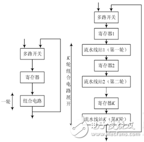 在每一个时钟周期,被部分处理过的数据块移人下一个流水线站,后续块则紧跟其上,占据他原来的位置,也就是说,一个流水线电路可以同时加密与他所含有的流水线站数量相等的数据块。以这种将循环展开为流水线的处理方式,展开后的流水线处理周期在理想情况下接近于基本结构处理周期时间的1/K。