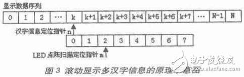 然后,依次对多汉字抽取像素信息,并按序排队存放于ROM之中,便可得到一个待显示数据序列。进一步通过寻址的方法来控制该数据序列的释放过程,就可实现在8×8 LED 发光二极管点阵上滚动显示多汉字信息的目的。图3给出的就是实现滚动显示多汉字信息的原理示意图。