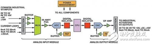 典型模拟I/O模块包括2个、4个、8个或16个通道。 为满足严格行业标准,这些模块需要提供过压、过流和EMI浪涌保护。 大多数PLC包括ADC和CPU之间、CPU和DAC之间的数字隔离。 高端PLC可能还有国际电工委员会(IEC)标准规定的通道间隔离。 很多I/O模块包括每通道软件可编程单端或差分输入范围、带宽和吞吐率。