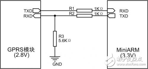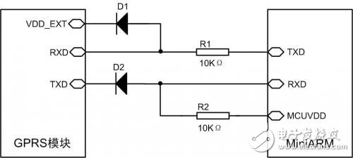 当GPRS模块TXD为高电平时,由于二极管D2的钳位作用,MiniARM的RXD会得到2.8V+VF高电平电压。当MiniARM的TXD为高电平时,由于二极管D1的钳位作用,GPRS模块的RXD会得到2.8V+VF高电平电压。