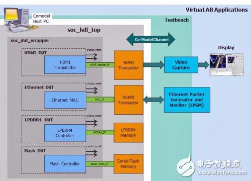 与传统原型相比,这一硬件仿真系统具有诸多优势。举例来说,整个设计都包含在其硬件及其相关联的PC中,无需目标板,也免去了外部电缆、电平位移器和速度适配器。公司使用Mentor Graphics虚拟实验室(VirtuaLAB)提供的各种功能(包括相机传感器、LCD显示屏、外部设备和多媒体接口)来替代物理目标系统。在这种环境下,主机与硬件仿真器设计基于事务级接口进行连接。参见图2。