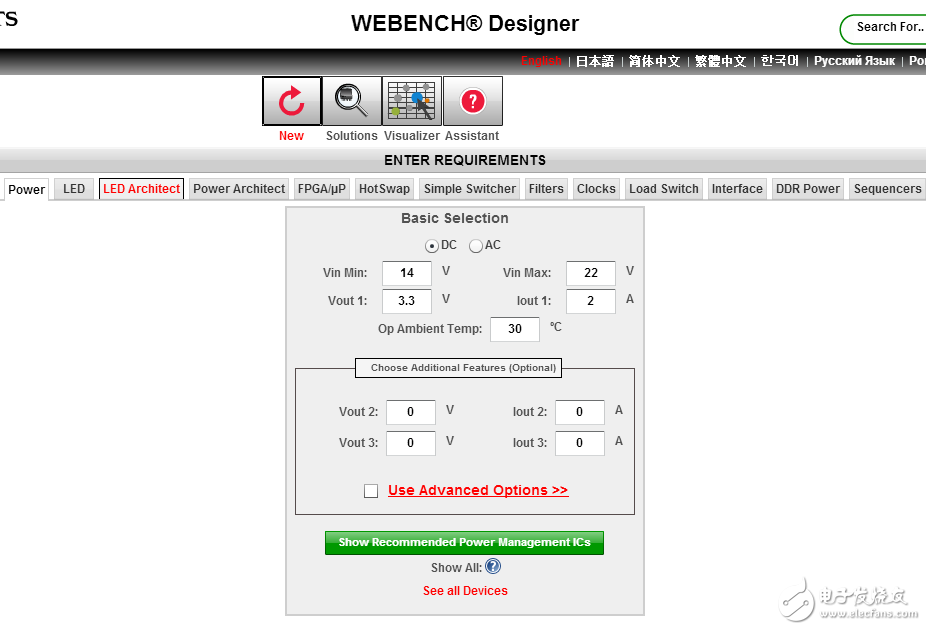 3、进入TI webench页面,选择您所需要设计的分类,(电源设计,还是LED设计等分类)并填写你需要的参数进行设计