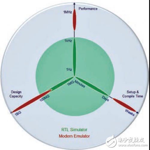 图 2:基于性能、设计能力和设置/编译时间的软件仿真与硬件仿真对比。