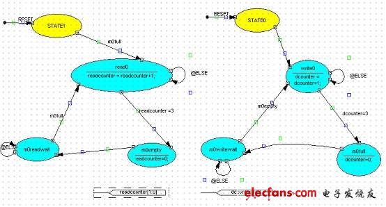 负责对M0写的状态机必须知道M0是空的,而负责对M0读的状态机必须知道M0是满的才能读。读完了通知负责对M0写的状态机M0是空的,可以写了。二个状态机同时并行工作。M0写的状态机在写操作完了,就等待M0空。M0读的状态机在读操作完了,就等待M0满。在STATECAD中,状态本身可以作为其他状态机的转移条件。这也正是在进行多状态机的协同设计中最需要的功能,能大大方便多状态机的设计。