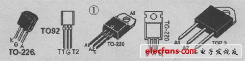 3.平时多掌握一些元器件的封装形式。常见的封装有TO-92、TO-220等,三极管的三个脚分别是E、B、C。小功率塑封装一般是TO-92,识别口诀是:“上平下圆脚朝己,从左到右E、B、C”(也有个别例外)。TO-220塑封三极管识别口诀是:“竖看字面脚朝下,从左到右B、C、E。”场效应管三个脚分别是D、C、S。T0-220塑封场效应管识别口诀是:“竖看字面脚朝下,从左到右C、D、S。可控硅三只脚单向为A、G、K,双向为T1(A1)、G、T2(A2),引脚与封装对应情况如图1所示。