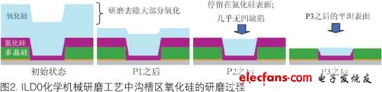 应用材料公司已经成功研发出一套在Reflexion? LK机台上实现的三步化学机械研磨工艺,以解决ILD0化学机械研磨过程中的WIW、WID和WTW厚度控制问题。第一步(P1),研磨移除大部分的ILD0电介质材料;第二步(P2),采用FA继续研磨,接触到栅极区域氮化硅层后停止;第三步(P3),栅极区域的氮化硅层被彻底磨掉,多晶硅栅极完全曝露。图2演示了在ILD0化学机械研磨过程中,沟槽区氧化硅研磨去除的全过程。