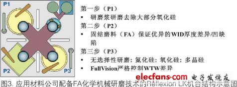 应用材料公司的Reflexion? LK研磨机台包括一个FA研磨盘和两个标准的旋转式研磨浆研磨盘,使用可以控制5个独立区域压力的Titan ContourTM研磨头(图3)。FA研磨盘配有3M公司生产的SlurryFreeTM 固结磨料卷轴和SlurryFree P6900基底研磨垫。研磨浆研磨盘配有Dow Chemical公司生产的IC1010TM研磨垫和3M公司生产的研磨垫修复刷。P1使用Cabot公司生产的Semi-SperseR SS-12氧化硅研磨浆;P2使用FA研磨液;P3使用专用的研磨浆。