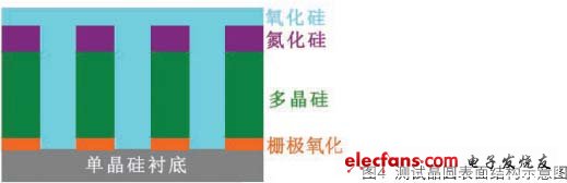 本文将统一使用一种简化的栅极结构(图4)以评估不同工艺的表现。栅极区域结构从上到下依次为:氧化硅/氮化硅/多晶硅/栅极氧化物/单晶硅,“沟槽”特指栅极与栅极之间的区域(结构为:氧化硅/单晶硅)。在尺寸大于50微米的测量区,薄膜厚度的测量使用Nanometrics公司的NanoTM 9010b。而对栅极尺寸小于100纳米的测量点,则需要通过扫描电子显微镜(SEM)进行纵切面观测。本文中,一部分样品通过机械劈裂的方式获得晶圆纵切面;另一部分样品使用聚焦离子束(FIB)局部切割晶圆露出纵切面。