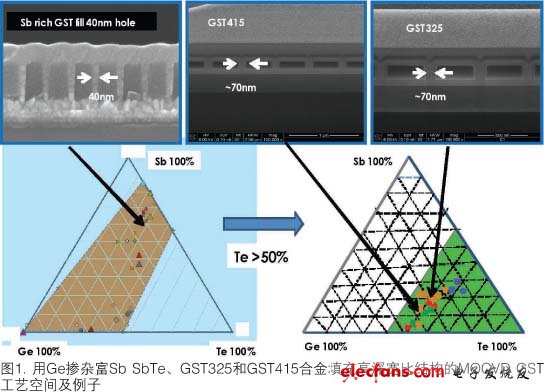 本文介绍了从开发成熟的MOCVD淀积GST材料性质获得的电学特性。一是用MOCVD淀积的325GST合金,与PVD GST合金比较,它减少复位电流2-3x,显示了NOR闪存应用的可能性。二是用MOCVD淀积的415GST合金,其置位速度65ns,10年数据保持温度118℃,比PVD GST 225合金高出近20℃,有望在SCM中有更高的速度以及在更高的温度环境下应用。