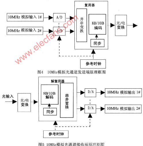 2路10MHz模拟光传输通道的信号频带为DC~10MHz,采用模数一数模的全数字调制方式,在单芯单模光纤中以1 3 1 Onm波长激光传输。发送时对2个模拟传输通道高速采样,进行A/D转换,通过光电转换电路,再复用到一根光纤上传输;反之,接收时,首先对从光纤上来的高速数字信号解复用成数字信号,进行D/A转换,还原成模拟信号。图4和图5为10MHz通道的原理框图。由于10 MHz通道的传输信号频率已经比较高,为保证信号质量,本方案的2个10 MHz通道均采用8位A/D、D/A转换器,采样速率为6O MHz,理论上10 MHz通道的信噪比SNR≈(6.02N+1.76)dB,可达48dB(用户要求为36dB)。