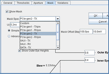 A library of standard eye masks is now included with SiViewer, which allows masks to be selected from a drop-down menu. Users can quickly customize and add their own definitions to the eye mask library, which includes support for both simple and advanced compliance masks.