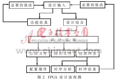 FPGA设计大体分为设计输入、综合、功能仿真(前仿真)、实现、时序仿真(后仿真)、配置下载等六个步骤,设计流程如图2所示。下面分别介绍各个设计步骤。