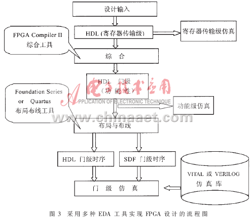 仿真工具Modelsim与综合工具FPGA Compiler II及布线工具Foundation Series或Quartus相配合实现FPGA设计的流程图如图3所示。
