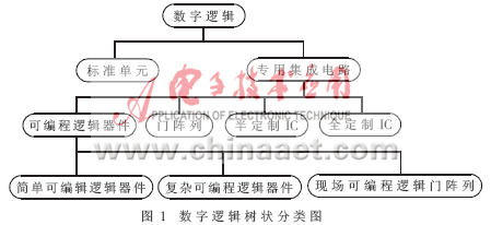 图1所示为数字逻辑树状分类图,由其可以看出,现场可编程门阵列(FPGA)是专用集成电路中可编程逻辑器件的重要分支。