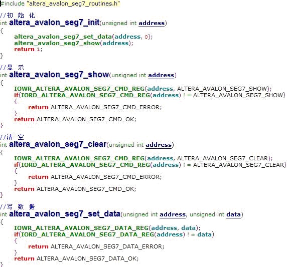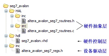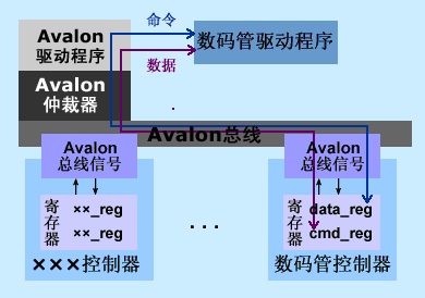 例如,数码管设备驱动要把数据“5”和“显示”命令传给数码管控制器,设计两个函数,由于数据和命令的传递必须经过总线,那么需调用总线驱动函数IOWR(基地址, 偏移量, 数据),另外,读取寄存器用到IORD(基地址, 偏移量),这两个函数在