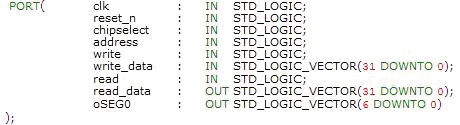 函数功能从字面上很好理解。刚才定义两个寄存器时,data_reg在前面,所以偏移量是0,cmd_reg在后面,偏移量是1。××_REG_MSK称 为掩码,avalon总线数据接口共32位,但我们设计的data_reg位宽是3,cmd_reg位宽为1,掩码的作用在于告知寄存器宽度,知道就行, 实际上用不着。××_REG_OFST是寄存器内的偏移量,这里同样用不着,先写上吧。