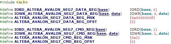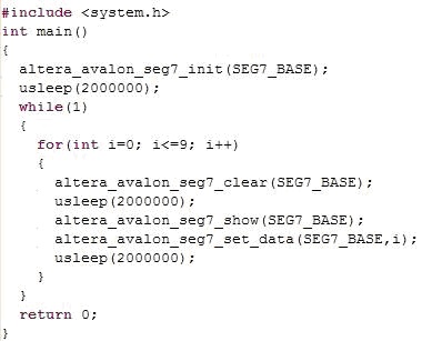 <14> 改动hello_world.c,代码的功能为:先初始化数码管,等待2秒钟,再进行0-9的循环,循环过程中穿插2秒钟的清屏。SEG7_BASE的宏 定义在system.h中,实际上就是在SOPC Builder中的seg7_avalon的基地址0x00010800。