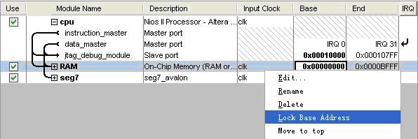 <7> 将这三个组件的名称改好看点,然后设定RAM的基地址为"0x00000000",再右键锁定基地址,如图: