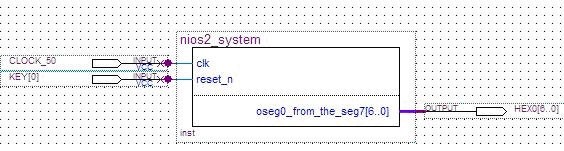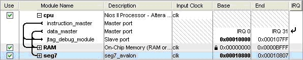 一个包含“数码管控制器”的最小系统至少由3部分组成:CPU必不可少,RAM存储代码,还有刚才设计的"seg7_avalon"。