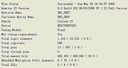 <11> 编译,查看编译报告,可见,48K的RAM占用了芯片83%的memory bits,差不多耗光了。
