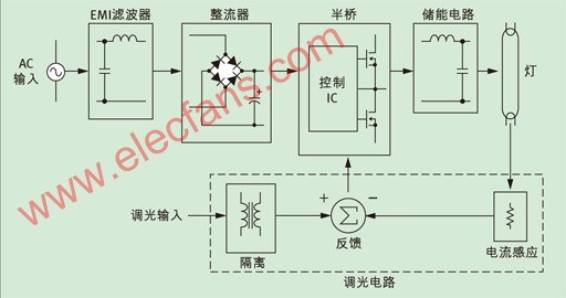 如图1所示,传统的镇流器需要一个输入噪声滤波器、整流器,以及平流电容器,来把AC电压输入转换为DC电源。它们要由一个副电路来产生高频率方波电压。这种电路由一个控制IC和半桥组成,且用一个共振输出级来预热、激发荧光灯并使其持续工作。这个设计如果要加上可调光控制功能,就需要隔离输入和电流检测副电路来量度电灯的电流。同时还要利用一个闭合环路反馈电路,来弥补电灯的非线性特性。这种设计会大幅增加解决方案所需的器件数目、成本和所占空间,因此缺点相当多。